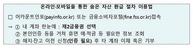 금융위원회는 행정안전부, 농림축산식품부, 해양수산부, 산림청, 금융감독원, 금융결제원, 상호금융중앙회와 함께 5일부터 다음 달 24일까지 '통장에서 잠자는 숨은 자산 찾기 캠페인'을 벌인다고 오늘(4일) 밝혔습니다.