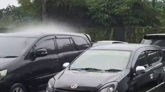 지난달 31일 서부 자바주의 한 호텔 주차장에서 딱 차 한 대, 검은색 SUV 위에만 장대비가 쏟아집니다.