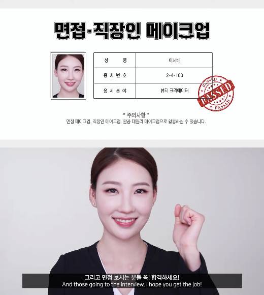 면접도 마찬가지로 적당히 화사하고 부드러운 데일리 메이크업이 좋다. 그러나 터칭 정도와 컬러 밸런스를 가늠하기 어렵다면 유튜버 이사배의 영상을 보며 고민을 해결할 수 있을 것. 그는 펄이나 쉐딩의 완급 조절을 강조하며 뚜렷한 이목구비를 연출하는가 하면 세심한 눈꼬리 디테일로 호감의 웃상 느낌을 자아냈다.