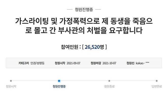 청원인은 두 달 전에 올린 청원 글에서 자신의 여동생이 부사관인 남편으로부터 가스라이팅과 가정 폭력을 당하다가 지난 7월 스스로 목숨을 끊었다고 밝혔습니다.