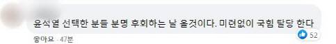 홍 후보 페이스북 게시물 댓글에도 "윤석열 찍은 사람들 후회할 날이 올 것, 미련없이 탈당한다", "5년 동안 홍준표 보고 냈던 당비 내놔라" 등 경선 결과를 받아들이지 못한 이들의 격렬한 반응이 쏟아졌다.