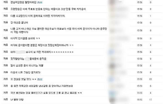 대형 커뮤니티인 ‘에프엠코리아’ 정치 게시판에는 홍 후보 탈락을 통탄하는 글들로 도배가 됐고, 일부 회원들은 국민의힘에서 탈당하겠다는 뜻을 밝히기도 했다. 그냥 “이재명 찍자”는 의견도 심심치 않게 발견된다. 심지어 직접 탈당을 하고 내용을 인증한 회원까지 등장했다.