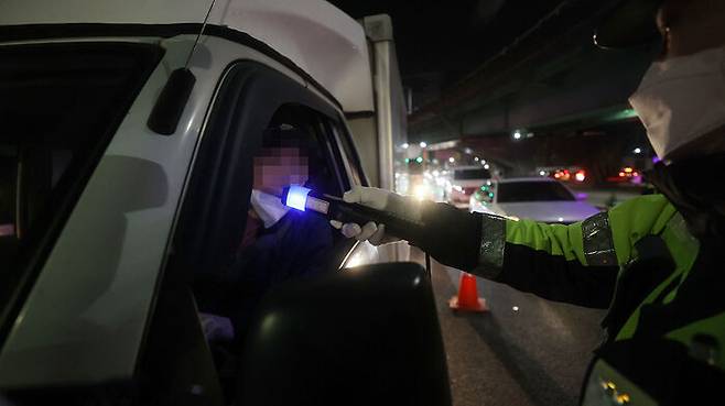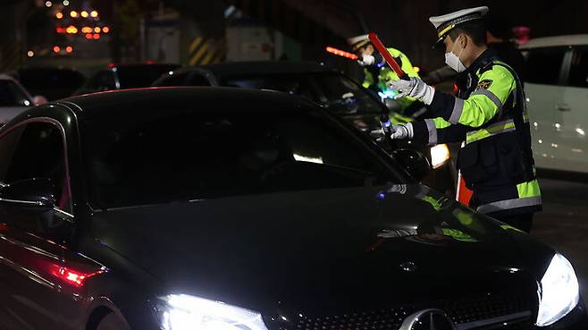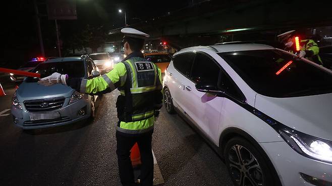 '단계적 일상회복' 시행 후 첫 주말인 6일 새벽 서울 영등포구 도로에서 음주운전 단속 중인 경찰