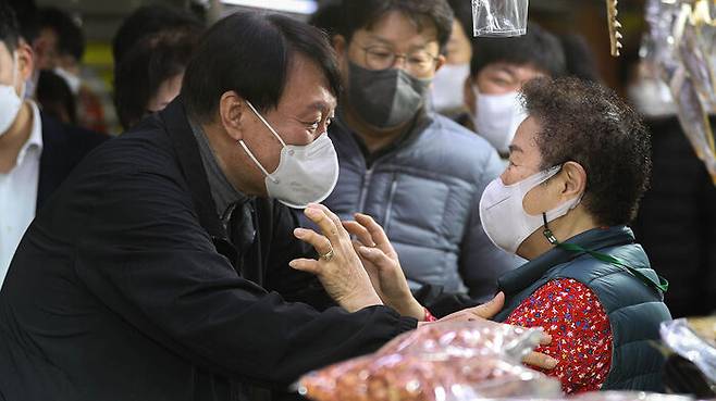 윤 후보는 오늘(6일) 시장을 돌며 상인들과 대화를 나눴습니다.