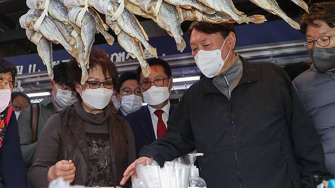 윤석열, 가락시장서 민생행보.."전국민 재난지원금 안 돼"