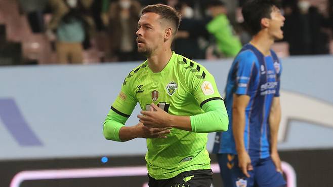 전반 23분 오른쪽 측면에서 쿠니모토가 올린 프리킥에 홍정호가 발을 갖다 댄 것을 울산 조현우 골키퍼가 완전히 잡지 못해 흐르자 골 지역 왼쪽에서 기다리던 송민규가 오른발로 마무리했습니다.