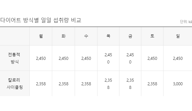 칼로리 사이클링이란 주기적으로 칼로리 섭취량을 바꿔주는 식사법이다. 매일 일정한 식단만을 고수하는 기존의 식단과 다르다는 점에서 먼저 소개했던 매크로 다이어트와 비슷하다.