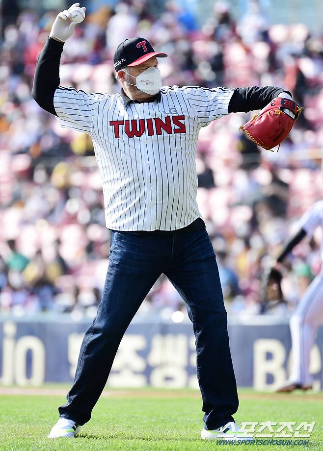 7일 서울 잠실야구장에서 LG와 두산의 준PO 3차전 경기가 열렸다. 경기를 앞두고 LG 외국인투수 켈리와 켈리의 아버지가 시구 시타 행사를 했다. 시구하고 있는 켈리의 아버지. 잠실=송정헌 기자 songs@sportschosun.com/2021.11.07/