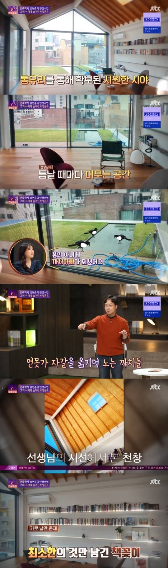 이후 공개된 유현준 교수의 사무실은 통유리로 이루어져 심플하고 깔끔함을 자아냈다. 통유리 밖의 미니연못도 눈에 띄었다. 유현준 교수는 "저걸 설치하니 까치들이 와서 물을 먹더라. 옆에 자갈을 깔아놨는데 자갈을 물어다 잔디밭에 두기도 한다"고 소소한 일상을 전했다.