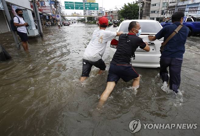 (방콕 EPA=연합뉴스) 폭우로 침수된 태국 방콕의 짜오프라야강 인근 도로에서 주민들이 고장난 차량을 밀고 있다 . 이날 짜오프라야강을 끼고 있는 방콕과 인접 지역 곳곳에는 폭우로 강물이 범람한 탓에 침수 피해가 속출했다. 2021.11.8