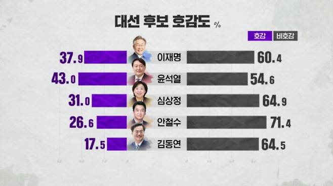 이재명 민주당 후보 호감 37.9%, 비호감 60.4%, 윤석열 국민의힘 후보, 호감 43%, 비호감 54.6%, 심상정 정의당 후보 호감 31%, 비호감 64.9%, 안철수 국민의당 후보 호감 26.6%, 비호감 71.4%, 김동연 전 경제부총리 호감 17.5%, 비호감 64.5%로 각각 조사됐습니다.