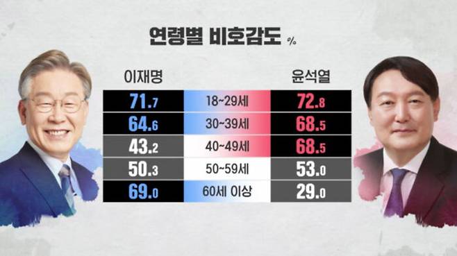 비호감도를 연령대별로 따로 분석해보면 이 후보는 20대 이하, 30대, 60대 이상에서, 윤 후보는 20대 이하, 30대, 40대에서 60%가 넘는 비호감도를 기록했습니다.