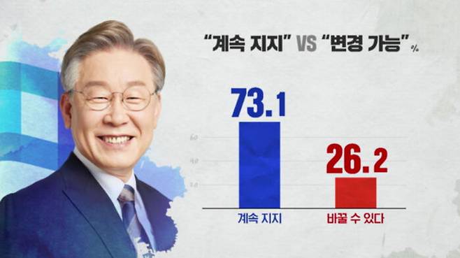이재명 후보 지지층에서는 계속 지지 73.1%, 변경 가능 26.2% 였고 윤석열 후보 지지층에서는 계속 지지 82.9%, 변경 가능 17.1% 로 조사됐습니다.