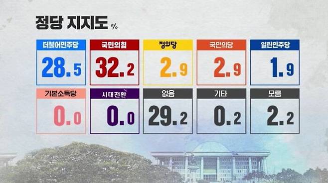 정당 지지도는 국민의힘 32.2%, 민주당 28.5%, 정의당 2.9%, 국민의당 2.9%, 열린민주당 1.9%였습니다.