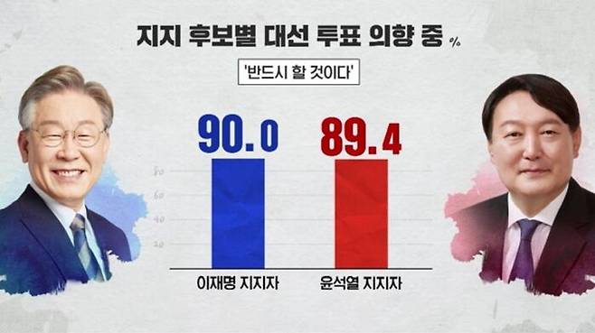 지지 후보별로 보면 이재명 후보 응답자의 90%, 윤석열 후보 응답자의 89.4%가 반드시 투표하겠다고 답했습니다.