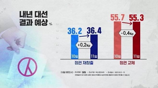 지난달 SBS 조사와 비교하면 정권 재창출은 0.2%포인트 늘었고 정권 교체는 0.4%포인트 줄었습니다.