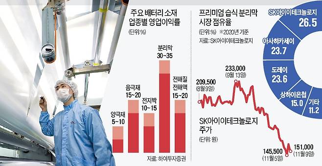 진입장벽이 높은 프리미엄 습식 분리막 세계시장 점유율 1위는 SK아이이테크놀로지다. 후발주자지만 일본 업체들을 제쳤다.
