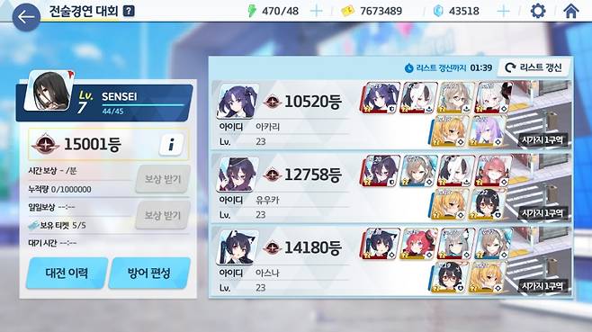 '전술 대회'는 6명의 캐릭터로 다른 이용자와 전투를 하는 PvP 콘텐츠다. 3명으로 구성된 공격 부대와 나머지 3명으로 방어 부대를 편성해야 하며, 자신은 상대의 방어 부대를 공격하고, 상대는 이용자의 방어 부대를 공격한다. 3분동안 자동 전투로 진행되며 기록한 순위에 따라 차등적으로 보상을 지급한다.