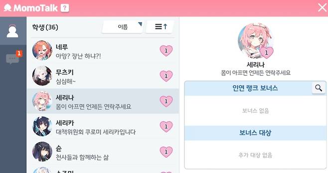 '모모톡'은 학생들과 대화를 나누는 메신저 콘텐츠로, 학생들과 이야기를 나누며 교감하고 호감도를 높여 능력치를 올릴 수 있다. 특히, 호감도를 높이며 로비화면(메인화면)을 장식할 수 있는 라이브 2D 일러스트 '메모리얼 일러스트'를 획득할 수 있다.