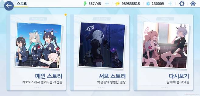 '스토리'에는 '메인 스토리', '서브 스토리', '다시보기' 콘텐츠가 있다. '메인 스토리'에서는 '키보토스'를 둘러싼 사건들을 감상할 수 있으며, ‘서브스토리’에는 각 동아리별 소소한 일상을 즐길 수 있다. ‘다시보기’를 통해 언제든 원하는 이야기를 다시 감상할 수 있다.