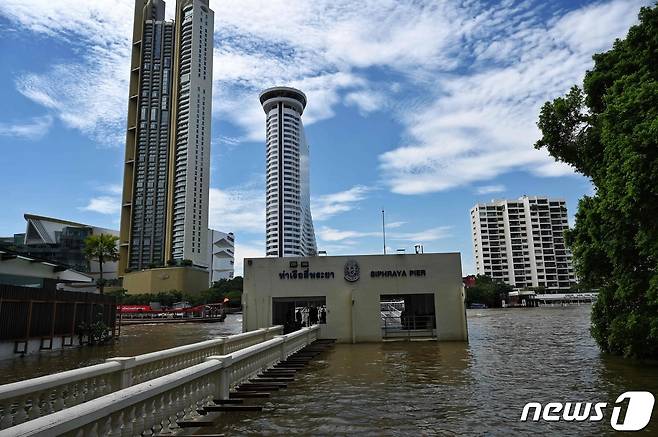 (방콕 AFP=뉴스1) 우동명 기자 = 9일 (현지시간) 폭우가 쏟아진 태국 방콕의 짜오프라야강 인근 저지대의 물에 잠긴 부두에서 주민들이 보트를 기다리고 있다.