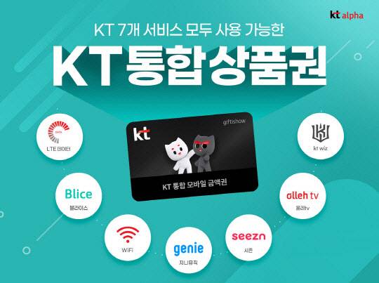 KT통합상품권은 KT의 유료 서비스를 이용할 수 있는 상품권으로 통신사 최초로 출시됐다. ‘기프티쇼’와 기업 고객용 ‘기프티쇼 비즈’, 카카오 선물하기와 위메프, 인터파크, 네이버쇼핑 선물하기 등 10여 개 제휴 판매처에서 구매가 가능하다. 이미 올레tv와 시즌, KT LTE 데이터, KT 와이파이 서비스에서 통합상품권을 사용할 수 있으며 연내 kt알파의 주력 사업부문인 ‘K쇼핑’도 신규 사용처로 추가될 것으로 알려졌다.