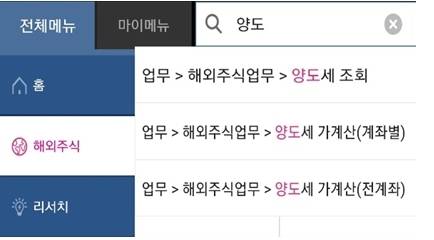 자료화면에서 보시는 것처럼, HTS나 MTS 메뉴 검색창에 ‘양도’라는 글자를 쓰시면 관련 메뉴가 뜰 겁니다.