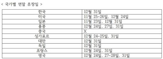일본과 대만은 12월 31일, 홍콩은 12월 27일과 31일, 독일과 프랑스는 12월 24일과 12월 31일에 쉽니다.