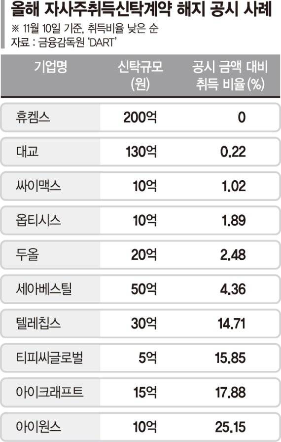 휴켐스의 경우 지난해 9월 3일 200억원 규모 자사주 취득 신탁계약을 체결했지만 1년 후 계약 해지 시점인 지난 9월 2일 매입 비율은 0%였다. 대교의 경우 지난 10월 29일 130억원 규모 자사주 취득신탁 계약을 해지했는데, 취득 비율은 0.22%에 불과했다. 이외 싸이맥스(1.02%), 옵티시스(1.89%), 두올(2.48%), 세아베스틸(4.36%) 등도 미미한 취득 비율을 나타냈다.