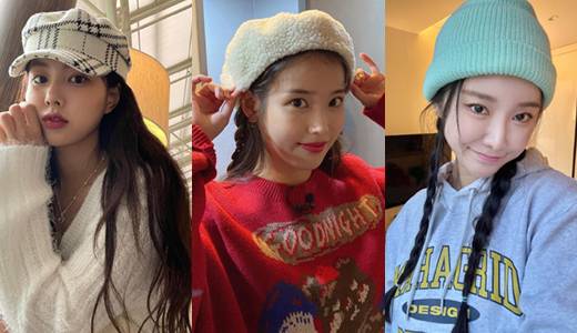 예술가 같은 콘셉트에 충실하기 좋은 베레모는 일명 빵모자로 불린다. 가수 아이유는 양털 베레모에 옆머리만 땋아 복고적인 포인트를 더했다. 또한 (여자)아이들의 미연은 베이지 모자에 브레이드 스타일로 새초롬한 소녀 감성을 뽐내 보였다. (사진출처: 수현, 효연, 민영, 지수, 손나은, 산다라박, 혜원, 태연, 세정, 효민, 미연, 아이유 인스타그램)