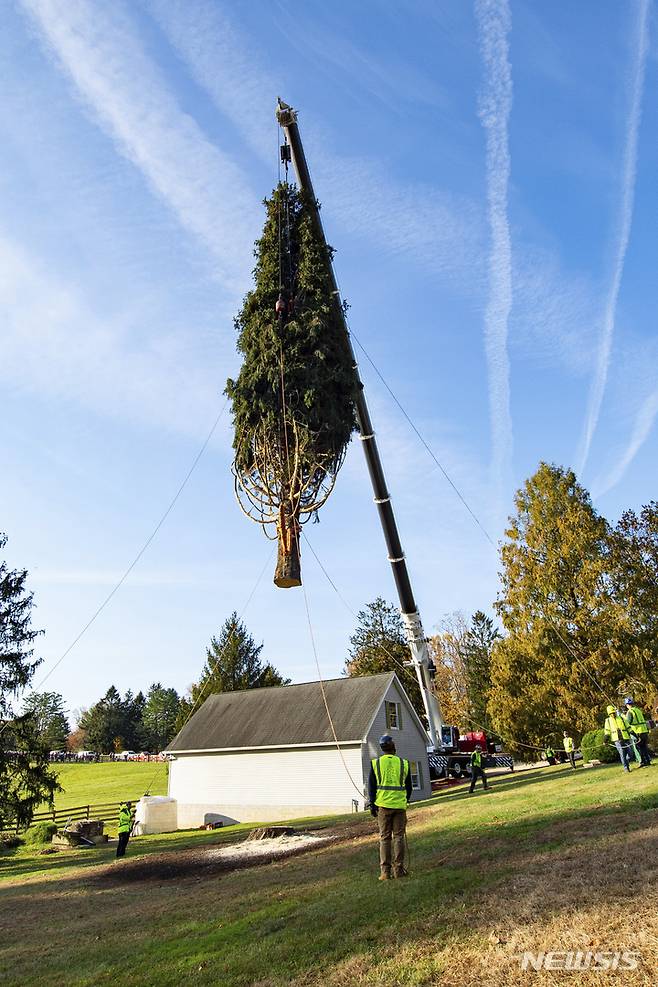 [엘크턴=AP/뉴시스] 11일(현지시간) 미 메릴랜드주 엘크턴에서 작업자들이 올해의 록펠러센터 크리스마스트리로 쓰일 나무를 베어 트럭에 싣는 작업을 하고 있다. 이 나무는 높이 약 24m, 무게 12t으로 13일 뉴욕의 록펠러센터 앞에 세워진다. 2021.11.12.