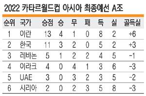대표팀은 11일 고양종합운동장에서 열린 5차전에서 UAE를 1-0으로 누르고 3승 2무(승점 11)로 A조 2위를 유지했다. 이란은 레바논에 2-1의 극적인 역전승을 거두고 조 1위(4승 1무·승점 13)를 지켰다. 대표팀은 이란에 승점 2 뒤진다.
