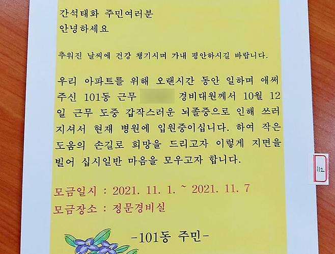 23년 동안 아파트를 지킨 60대 경비원이 근무 중 건강 악화로 쓰러지자 주민들이 십시일반으로 정성을 모았습니다.