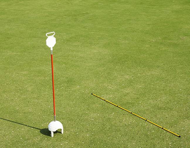 목표 뒤 1m 지점에는 얼라인먼트 스틱을 두고 공을 굴린다