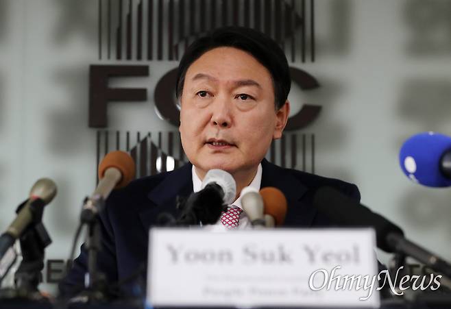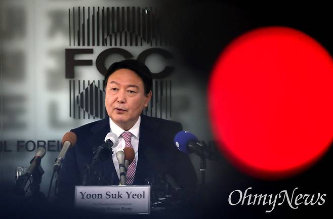 | ▲ 국민의힘 윤석열 대선 후보가 12일 오후 서울 중구 한국프레스센터에서 열린 서울외신기자클럽(SFCC) 초청 기자간담회에서 모두발언을 하고 있다. |
