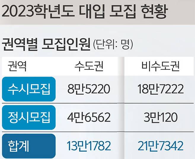 고2 학생들이 대입을 치르는 2023학년도 입시의 경우 전체적으로 수시모집 비중이 늘고 정시모집 비중은 준다. 하지만 수도권 대학만 놓고 본다면 정시모집이 확대된다. 교육부의 권고에 따라 수도권의 16개 주요 대학에서는 수능 위주의 정시 비중을 40% 이상으로 확대하기 때문이다. 그만큼 수능이 중요해졌다는 의미다. 반면 비수도권에서는 수시 학생부교과전형의 비율이 가장 높다. 비수도권에서는 전체 선발 인원의 58.4%를 이 전형으로 모집한다.