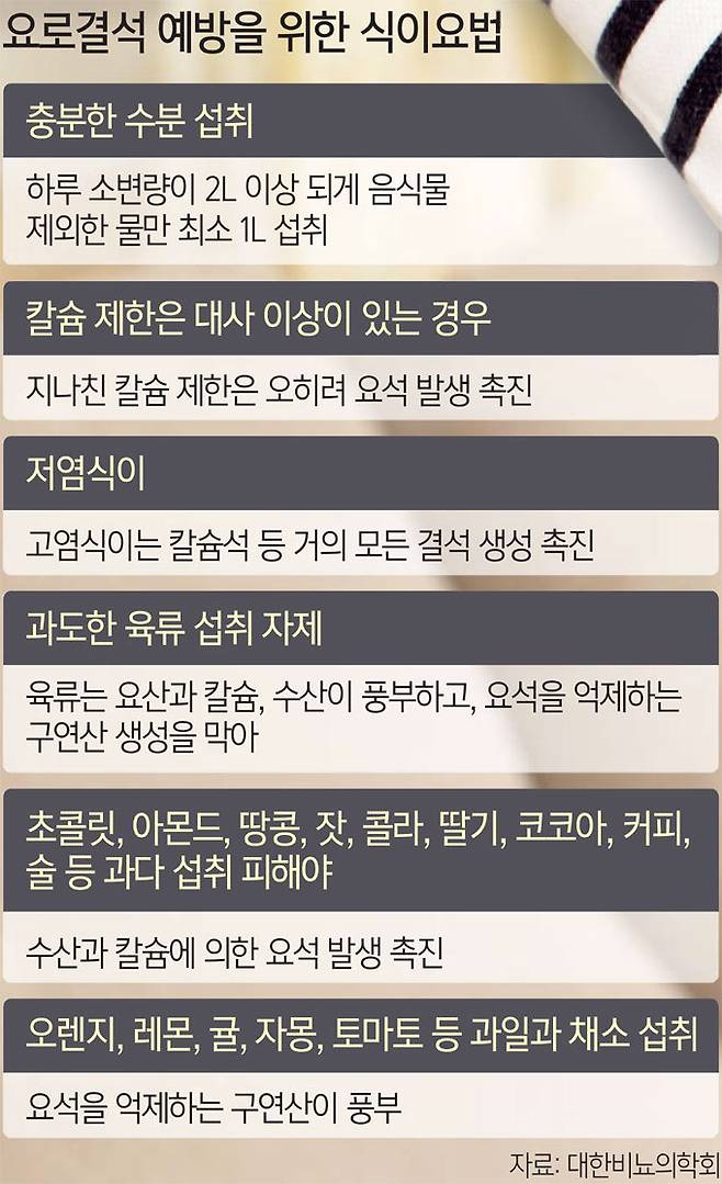 최태수 교수는 “가장 흔한 결석의 성분이 칼슘이기에 칼슘 섭취를 줄이면 결석 위험을 줄인다고 생각할 수 있다. 그러나 지나친 칼슘 제한은 결석 발생의 위험성을 높이고, 칼슘 균형에 영향을 미쳐 뼈 손실이나 골다공증 등을 초래할 수 있다. 하루 1000∼1500mg의 적정 칼슘 섭취가 좋다”고 조언했다. 최 교수는 또 “비만의 경우 소변에서 결석의 원인이 되는 옥살산, 요산, 나트륨, 인산 등의 배출이 늘어나게 된다. 비만도 요로결석의 위험성을 높일 수 있다”며 “규칙적인 운동과 식이조절을 통해 적절한 체중관리에 신경을 써야 한다”고 지적했다.