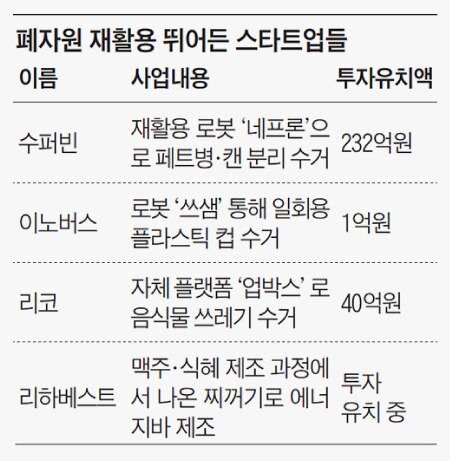 대기업들은 이런 스타트업들에 지분을 투자하거나, 자체 육성 프로그램으로 스타트업을 지원하는 방식으로 폐자원 수거 사업에 뛰어들고 있다. 폐자원 수거 사업에 직접 뛰어들게 되면 골목 상권을 침해한다는 비판을 받을 수 있기 때문이다. 석유화학 회사인 SK지오센트릭(옛 SK종합화학)은 수퍼빈에 55억원을 투자해 5% 지분을 확보했다. SK지오센트릭 측은 “폐플라스틱을 수거해 원료로 재활용하는 ‘도시유전’ 기업으로 거듭나겠다는 계획을 실천하기 위한 전략적 투자”라고 말했다. 롯데그룹도 수퍼빈에 9억원을 지원하고, 롯데마트와 세븐일레븐 매장에 재활용 로봇 네프론 50대를 배치했다. 리코는 삼성웰스토리·아워홈·스타벅스 같은 대형 업체를 고객사로 유치한 데 이어 현재까지 총 40억원의 투자를 유치했다.