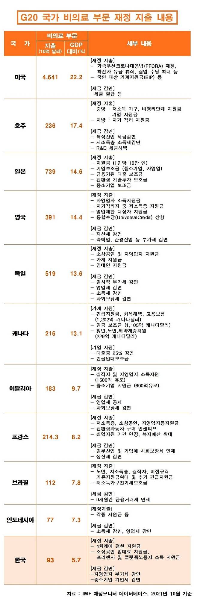 일단 우리나라의 재난지원금 수준을 외국과 비교할 필요가 있습니다. 국제통화기금(IMF)이 주요 20개국(G20) 국가의 재정 상황을 주기적으로 모니터 한 보고서를 참고했습니다. IMF는 국가별 코로나 예산 규모와 사용처를 꼼꼼히 분석해 주기적으로 보고서를 내고 있습니다.