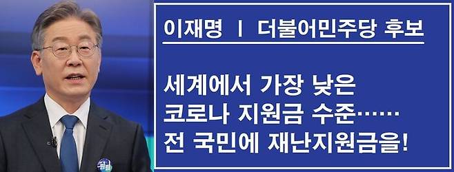 이재명 후보는 지난 8일 자신의 SNS에서 우리나라 코로나 지원금 수준이 세계에서 가장 적은 수준임을 전제했습니다. 그러면서 "확장 재정을 통해 가계와 자영업자 추가 지원이 반드시 필요하다"고 했습니다.