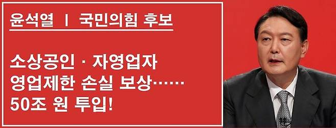 윤석열 후보는 지난 7일 한 언론과의 인터뷰에서 "새 정부 출범 100일 동안 50조 원을 투입해 정부의 영업 제한으로 인한 피해를 원칙적으로 전액 보상하겠다"고 공약했습니다. 자영업자를 대상으로 손실 보상에 막대한 예산을 투입하겠다는 겁니다. 지난 9일에는 "코로나로 피해를 많이 입고 곤경에 처한 분들 중심으로 두툼하게 지원하고, 그 지원도 역시 실해 보상 개념으로 가야 한다"고 했습니다.