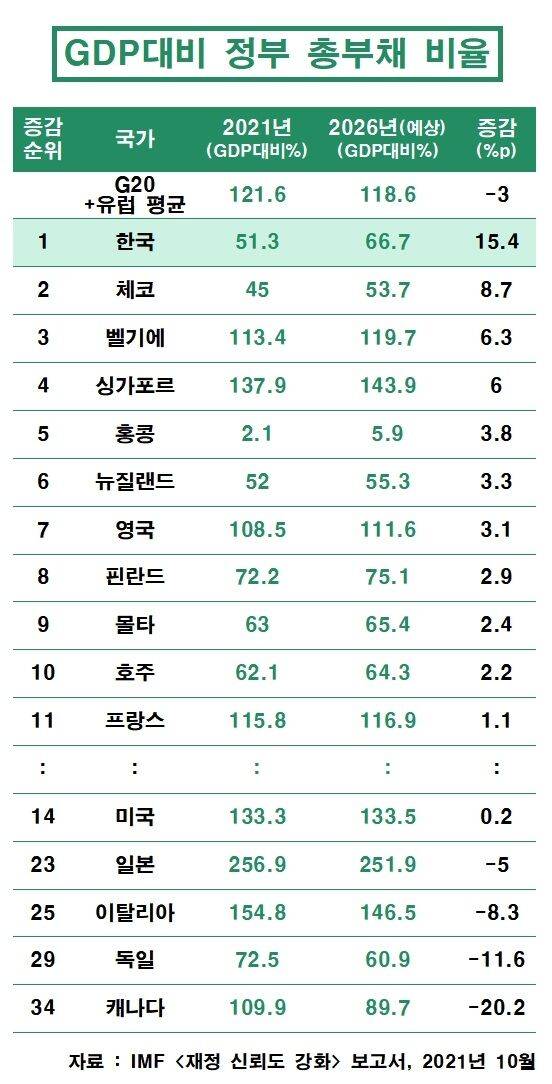 참고로 기획재정부는 우리나라의 GDP 대비 부채 비율을 47%로 계산하고 있는데, IMF는 정부뿐만 아니라 비영리 공공기관까지 합산하기 때문에 부채 비율이 더 높게 나옵니다.