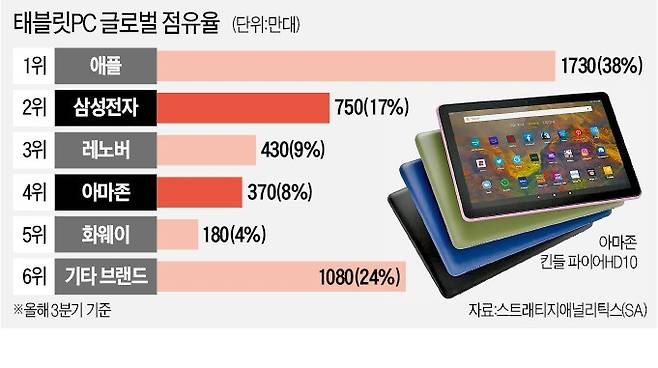 킨들 파이어는 세계 4위 태블릿 브랜드다. 2018년 출시된 ‘킨들 파이어 HD8’의 출고가는 약 9만4000원(79.99달러)으로 책정됐다. 최상위 모델이자 최신 모델인 ‘킨들 파이어 HD10’의 가격도 약 17만원(150달러)에 불과하다. 가격이 저렴한 만큼 램(RAM)과 저장용량 등 각종 스펙(사양) 수준은 낮은 편이다. 자체 운영체제(OS)와 전용 앱만 이용할 수 있다는 단점도 있다. 다만 화질은 준수해 온라인동영상서비스(OTT)를 비롯한 영상 시청에 특화된 제품이란 평가를 받는다.