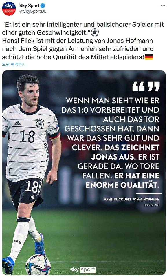 [골닷컴] 김현민 기자 = 한스-디터 플릭 신임 감독 체제에서 전승 행진을 이어오고 있는 독일이 아르메니아전에서 스리백 전술을 실험했다. 플릭 감독 하에서 오른쪽 풀백 주전으로 낙점된 요나스 호프만이 윙백으로 전진 배치되어 1골 1도움을 올리며 4-1 대승을 견인했다.