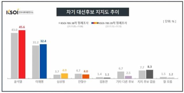 한국사회여론연구소(KSOI)가 TBS 의뢰로 지난 12일부터 이틀간 전국 성인 1009명을 상대로 조사한 결과 윤 후보 지지 응답 비율이 45.6%를 기록했다. 이 후보 지지율은 32.4%로, 윤 후보보다 13.2% 포인트 뒤처졌다.