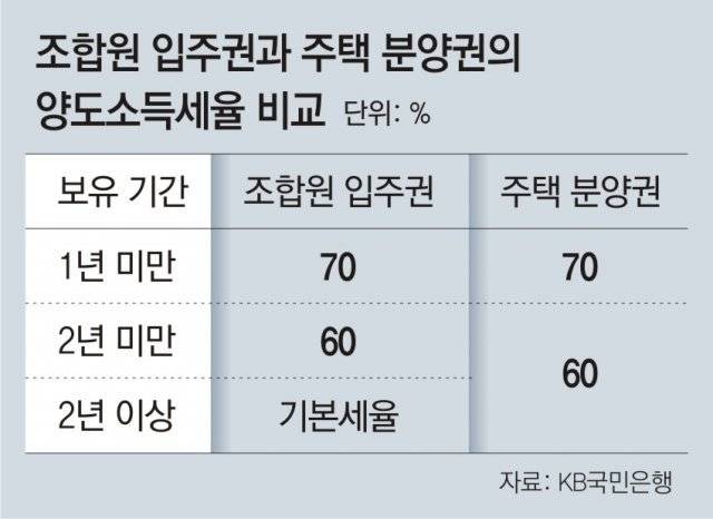 다만 조합원 입주권과 주택 분양권 모두 짧은 기간 내에 양도하는 경우 막대한 세금을 낼 수 있으니 주의해야 한다. 1년 미만 보유하면 70%, 2년 미만 보유하면 60%의 단일 세율이 적용된다. 또 주택 분양권은 2년 이상 보유하더라도 60%의 세율이 적용된다.