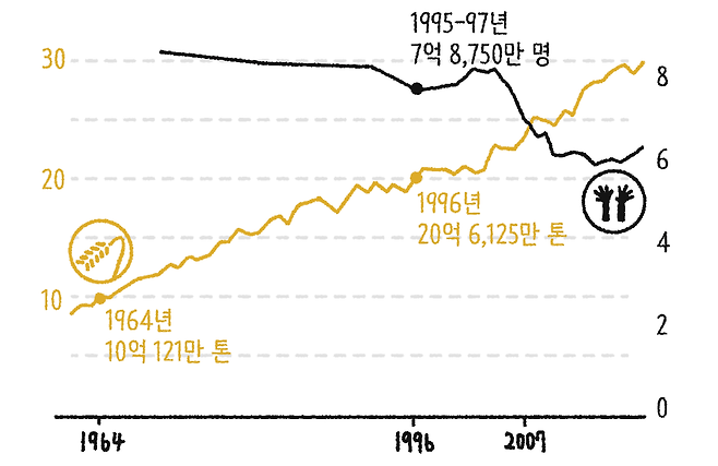 과거와 비교해서 식량 생산은 늘었을 텐데, 왜 기아 문제는 해결되지 않는 걸까요? 아래 그래프는 1960년대부터 2019년까지 전 세계 식량 생산량과 영양실조 인구를 함께 나타낸 자료입니다. 영양실조 데이터는 가장 오래된 게 1969년과 71년 사이에 조사된 자료인데, 당시 8억 5,000만 명 이상으로 기록되어 있더라고요. 1995년과 1997년 사이의 조사에서 처음으로 8억 명 밑으로 내려왔습니다. 그래프에선 식량생산과 비교하기 위해 2019년까지만 그렸지만, 2020년엔 (위에서 이야기한 것처럼) 7억 6,800만 명으로 훌쩍 늘어났죠.