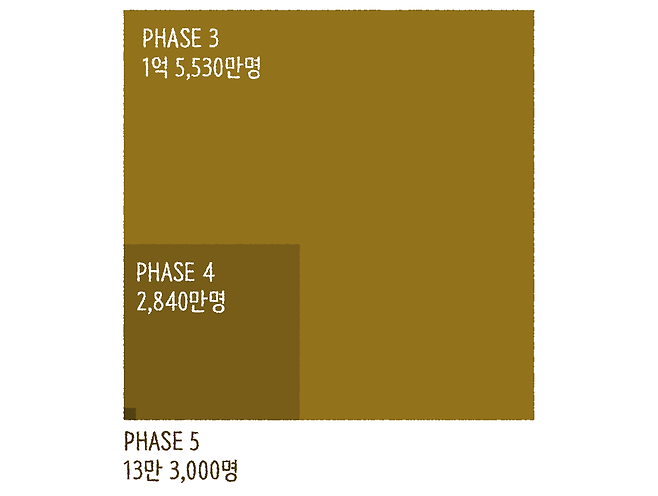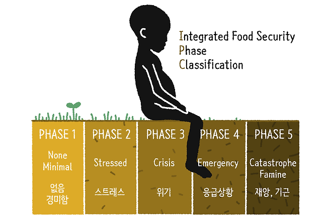 일단 전 세계 기아 상황이 어떤 지부터 짚어볼게요. UN 식량농업기구에서 지표를 하나 개발했습니다. IPC라는 녀석인데, 각 국가별로 영양 상태가 어떤지 등급을 나누기 위해 사용하는 지표죠. IPC 분류는 기아상황을 총 5단계로 나눠서 관리하는데 3단계부터는 정말로 심각한 상황을 나타냅니다. 2020년, 전 세계에서 3단계 이상의 기아 위기에 처한 사람들은 모두 1억 5,530만 명. 2020년 일본의 인구가 1억 2,600만 명 정도인데 그보다 많은 사람들이 기아 위기 상태에 처해있는 겁니다. 얼마나 심각한지 감이 오죠? 게다가 가장 심각한 5단계에 노출된 사람들도 13만 명이 넘었어요.