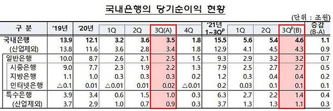 16일 금융감독원이 발표한 2021년 3분기 국내은행 영업실적(잠정)에 따르면 19개 국내은행의 3분기까지 누적 당기순이익은 작년 같은 기간보다 50.5% 증가한 15조5천억 원으로 집계됐습니다.