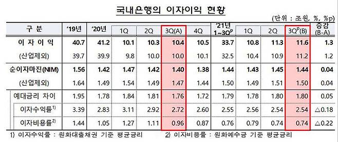 3분기에 국내은행은 이자 이익으로 11조6천억 원을 거둬들였으며 작년 3분기보다 1조3천억 원이 더 많습니다.